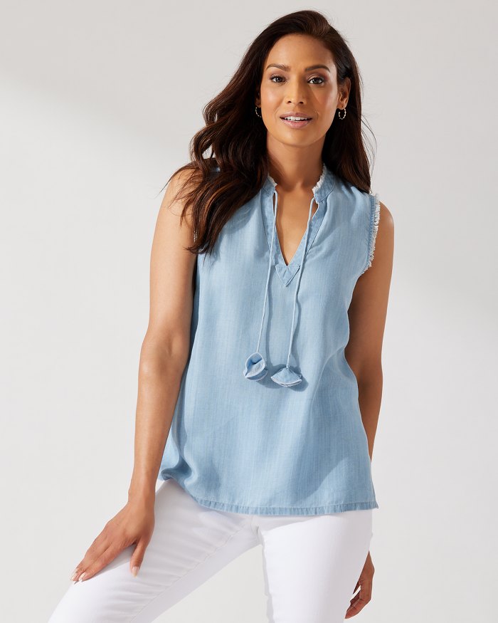 Fringe detailing and fun, on-trend tassels make this top the star of every brunch or happy hour. Designed with a classic chambray fabric, this top was made for lightweight ease and all-day comfort.