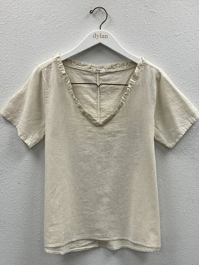 A perfect drape in a comfortable T-shirt? Yes, it is possible! The Bella blouse is a cotton linen blend t-shirt with a little ruffle around the v-neck. Sweet!